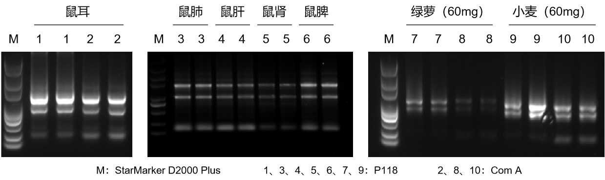 采用 GenStar #P118 提取小鼠不同部位組織、植物樣本綠蘿、小麥 RNA,進(jìn)行瓊脂糖凝膠電泳。結(jié)果顯示,GenStar #P118 適用于動植物細(xì)胞、組織、酵母細(xì)胞、細(xì)菌等多種樣本的總 RNA 提取,且提取效果優(yōu)于 Com A。