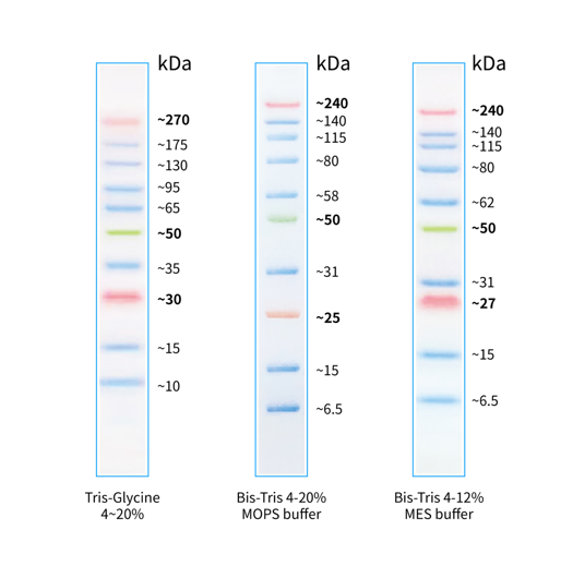 本產品由跨度從 10-270 kDa 的 10 種高度純化預染的重組蛋白質組成,各條帶濃度約為 0.1-0.5 mg/ml。其中 30 kDa 和 270 kDa 條帶為加強條帶,方便判斷各個條帶的準確位置。本產品適合作為 SDS-PAGE 電泳時,變性蛋白樣品的分子量參照,并可實時觀察蛋白樣品的電泳分離狀況,也可用于檢測 Western blot 的轉膜效率。由于共價結合的染料會影響蛋白質分子的電泳遷移率,本產品僅適于粗略地估計目的蛋白樣品的分子量。