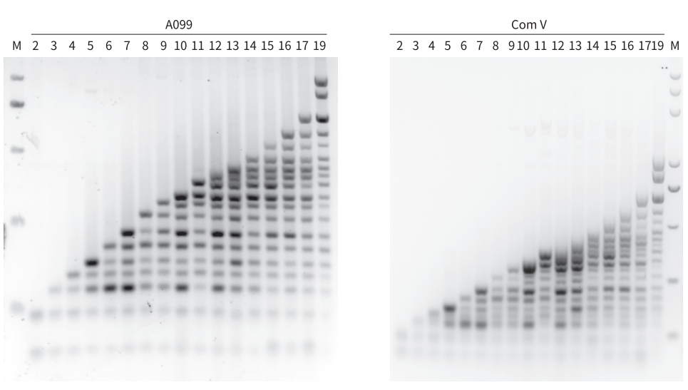 以 Human 基因組為模板,擴(kuò)增 2~19 重目的片段(50-1028 bp)。結(jié)果顯示,所有目的片段都清晰可見,A099 可在同一反應(yīng)中擴(kuò)增多達(dá) 19 個(gè)目的片段,且擴(kuò)增效率和條帶清晰度均優(yōu)于 Com V