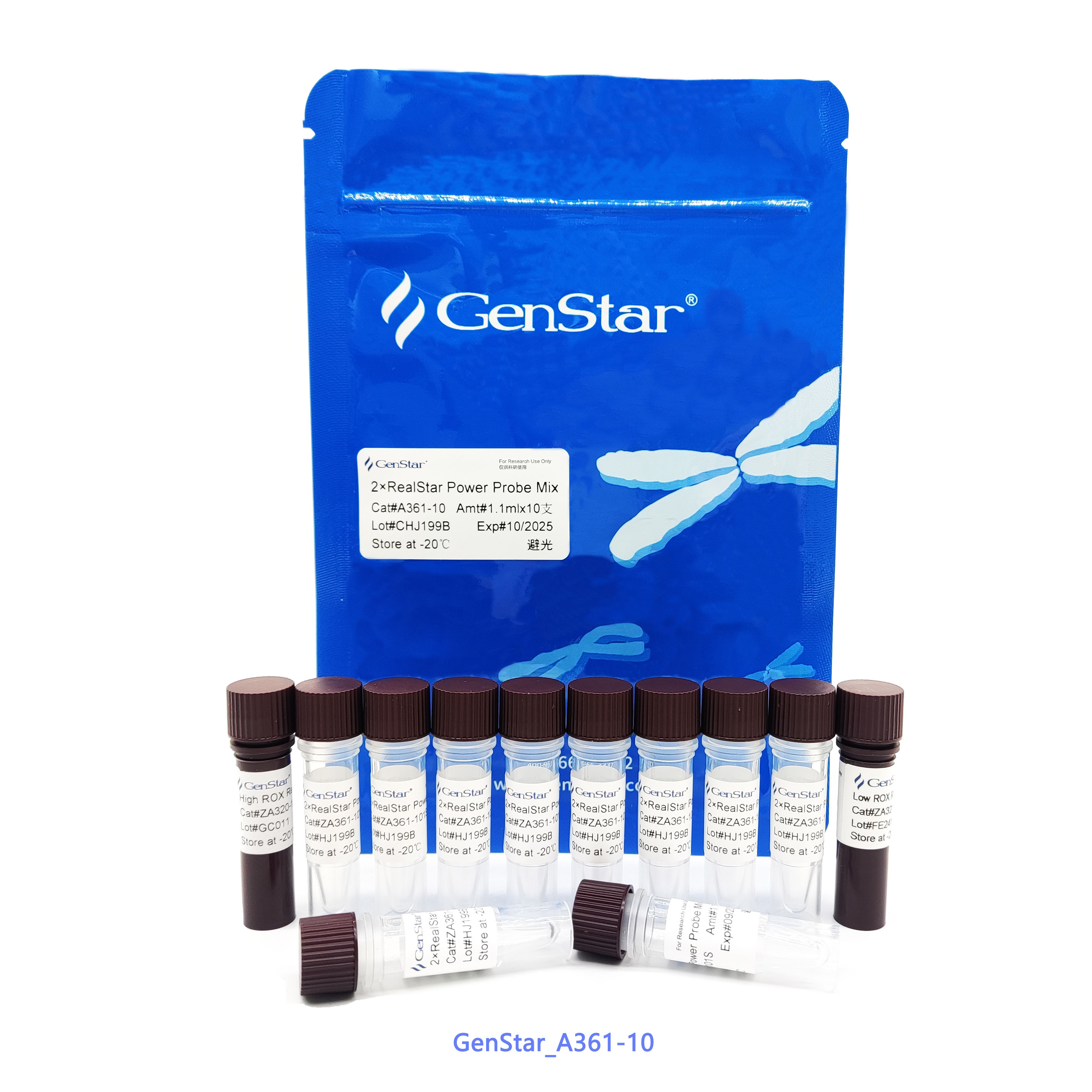 本產(chǎn)品是專用于探針?lè)ǎ═aqMan,Molecular Beacon 等)實(shí)時(shí)熒光定量的預(yù)混體系。產(chǎn)品含有優(yōu)化濃度的 GenStar Power HSTaq DNA Polymerase、dNTPs、Mg2+、反應(yīng)緩沖液和穩(wěn)定劑等成分。Power HSTaq DNA Polymerase 在 75℃ 以下沒(méi)有活性,從而有效避免在常溫條件下由引物和模板非特異性結(jié)合或引物二聚體而產(chǎn)生的非特異性擴(kuò)增,酶的激活需要 95℃ 孵育 10 min。反應(yīng)體系可在室溫下配制,無(wú)需在冰上完成,操作方便。主要用于基因組 DNA 靶序列和 RNA 反轉(zhuǎn)錄后 cDNA 靶序列的檢測(cè),如基因表達(dá)分析、拷貝數(shù)分析、SNP 基因型分析等,適用于不同類型探針?lè)晒舛?PCR。