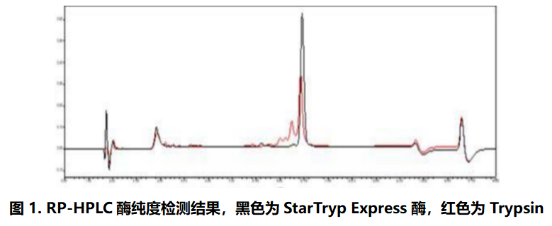 結(jié)果顯示,與胰酶相比,StarTryp Express 酶純度較高,峰圖明顯優(yōu)于 Trypsin。