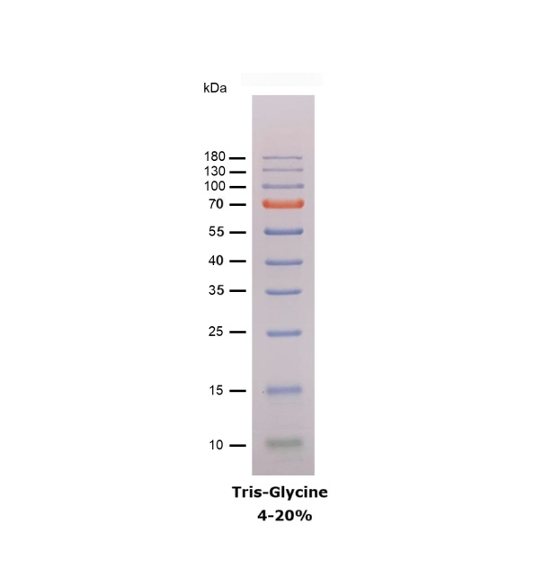本產(chǎn)品由跨度從 10-180 kDa 的 10 種高度純化預(yù)染的重組蛋白質(zhì)組成。其中 10 kDa 條帶為綠色預(yù)染條帶,70 kDa 條帶為紅色預(yù)染條帶,方便判斷各個(gè)條帶的準(zhǔn)確位置。本產(chǎn)品適合作為 SDS-PAGE 電泳時(shí),變性蛋白樣品的分子量參照,并可實(shí)時(shí)觀察蛋白樣品的電泳分離狀況,也可用于檢測 Western blot 的轉(zhuǎn)膜效率。由于共價(jià)結(jié)合的染料會影響蛋白質(zhì)分子的電泳遷移率,本產(chǎn)品僅適于粗略地估計(jì)目的蛋白樣品的分子量。