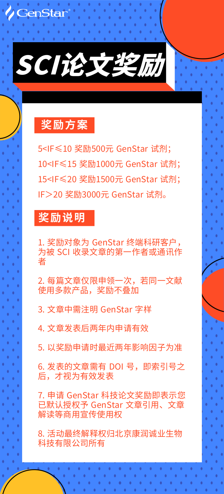 GenStar 自成立以來(lái),一直深耕于分子生物學(xué)領(lǐng)域上游核心原料及配套體系的研發(fā),服務(wù)了全國(guó)數(shù)千家實(shí)驗(yàn)室的科研人員。使用 GenStar 產(chǎn)品的 SCI 論文總數(shù)已達(dá)千余篇,其中包含《Nature》、《Science》、《Cell》等高水平的學(xué)術(shù)期刊。為了感謝廣大客戶(hù)的支持與信任,GenStar 繼續(xù)推行發(fā)表科技論文獎(jiǎng)勵(lì)機(jī),使用 GenStar 產(chǎn)品發(fā)表科技論文的人員均可申請(qǐng)。希望更多新老客戶(hù)參與其中,期待和您一起分享成功的喜悅。