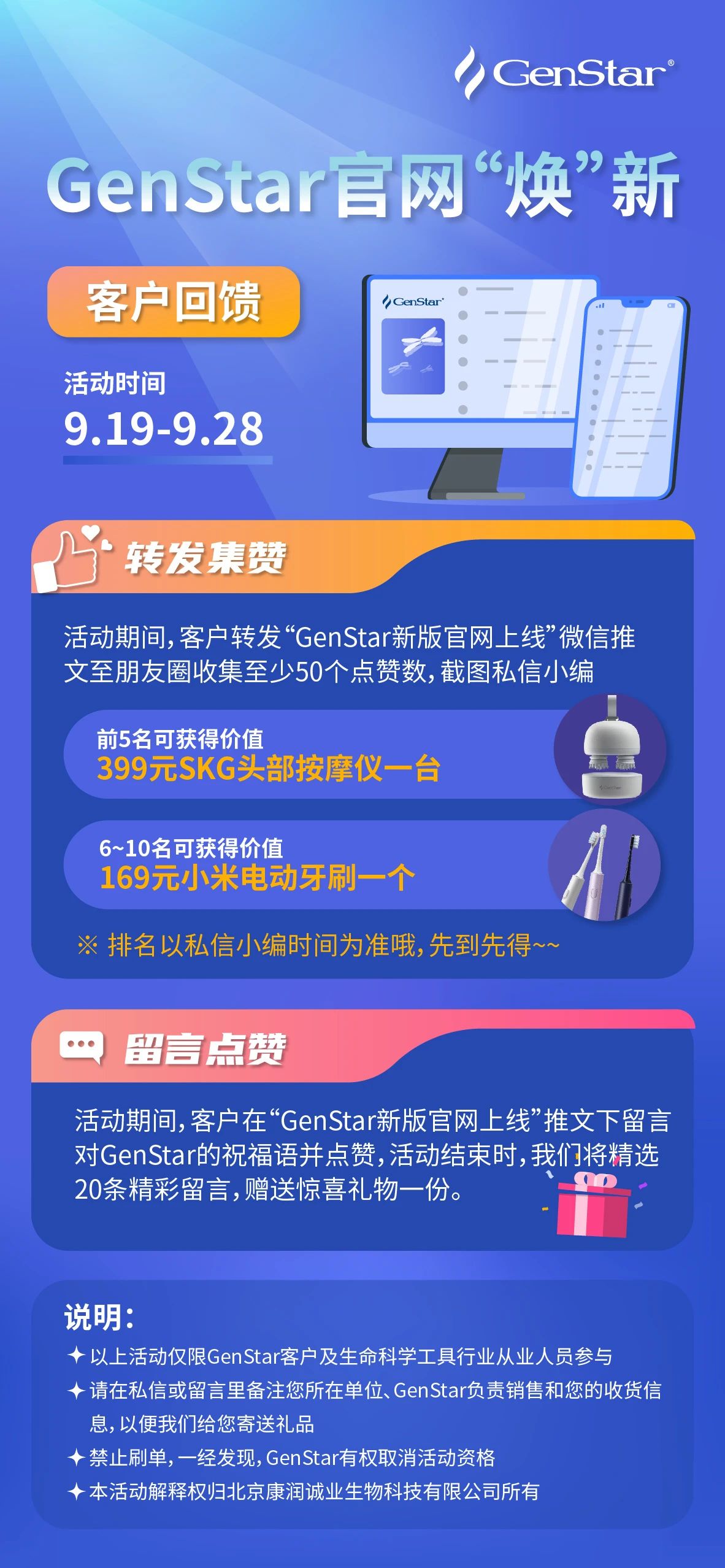 1. 轉(zhuǎn)發(fā)GenStar公眾號(hào)推文(可點(diǎn)擊此處跳轉(zhuǎn))至朋友圈點(diǎn)贊數(shù)滿50,截圖私信GenStar公眾號(hào)鎖定禮品,滿24h后再次截圖并備注單位,負(fù)責(zé)銷售和收貨信息。無文章保留24h截圖視為棄權(quán),獲獎(jiǎng)?wù)唔樠右晃弧?/span>