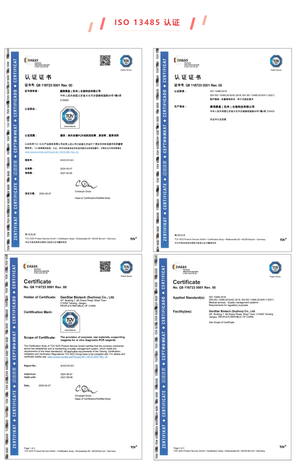 近日,康潤景星(蘇州)生物科技有限公司(GenStar全資子公司)經(jīng)國際第三方檢測認證機構(gòu)TÜV南德意志集團(以下簡稱“TÜV南德”)的嚴格審查,再次通過ISO9001:2015質(zhì)量管理體系和ISO13485:2016醫(yī)療器械質(zhì)量管理體系認證審核,并獲得證書。